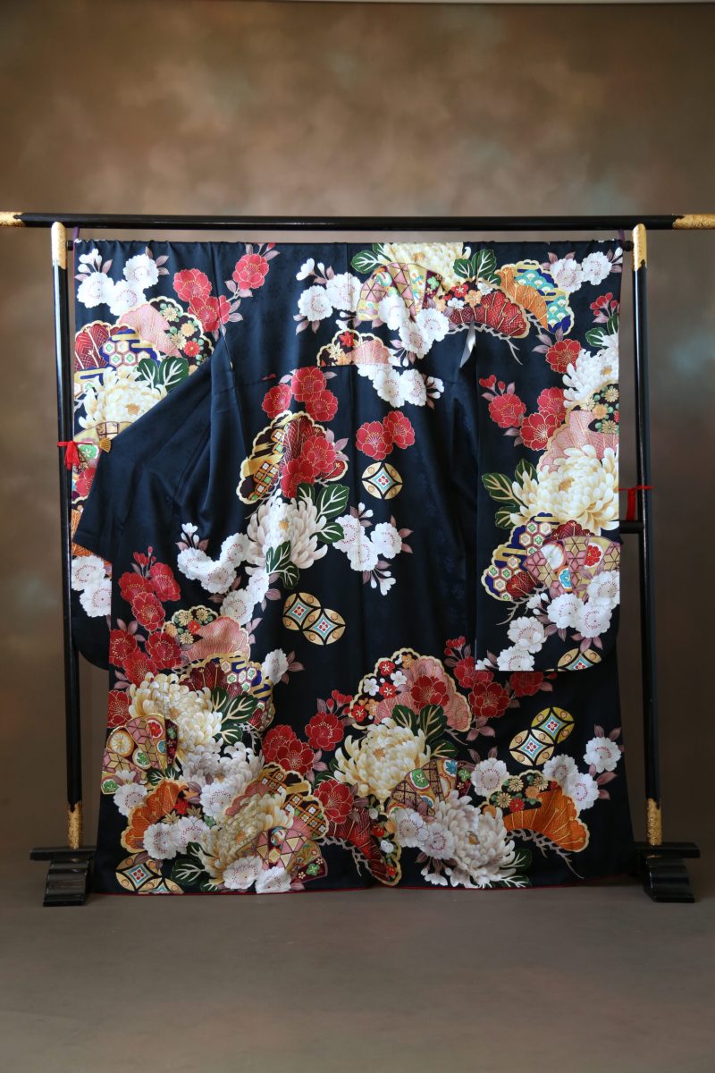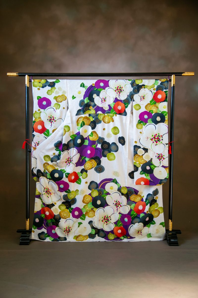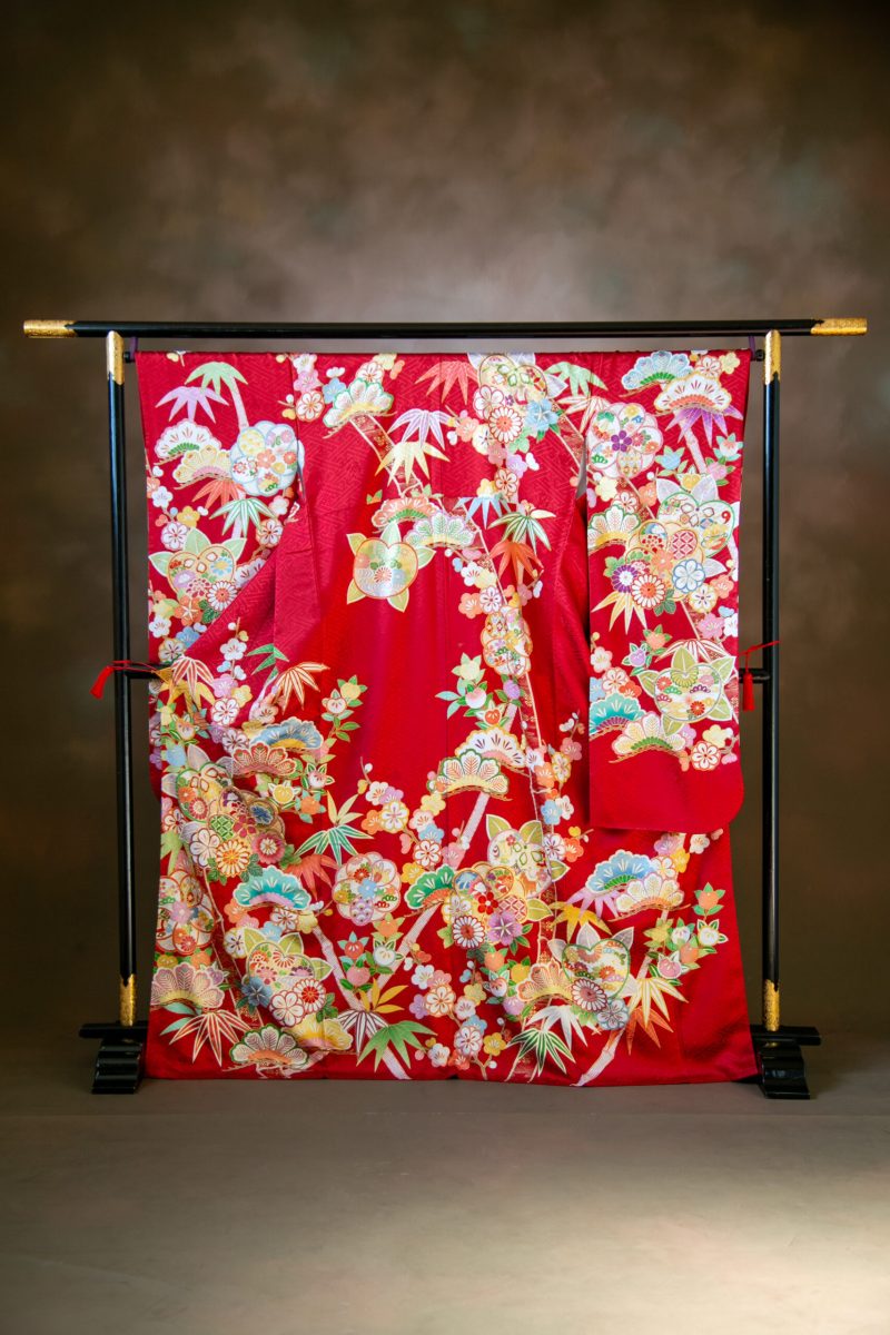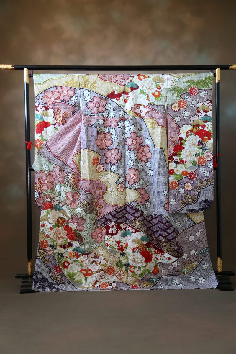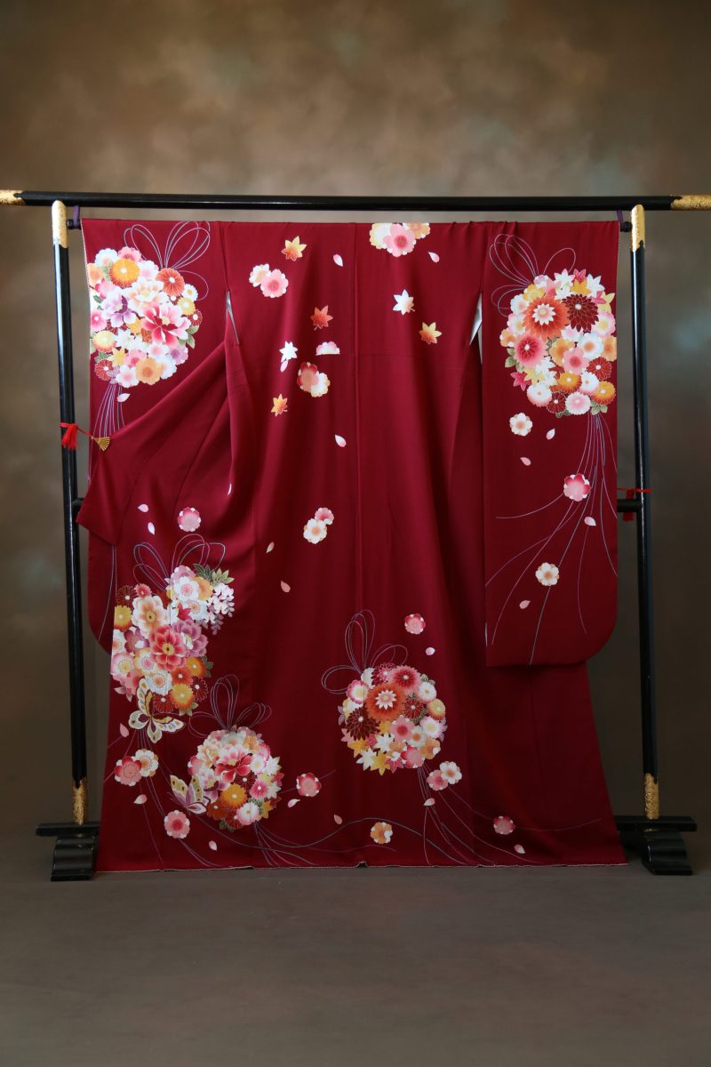 振袖一式に含まれるもの(振袖、帯、長襦袢(半衿付き)、帯揚げ、帯締め、重ね衿、腰紐5本、伊達巻2本、衿芯、前板(大小)、帯枕)※草履バッグ、肌着、足袋、ショールは別料金にてお受けいたします。