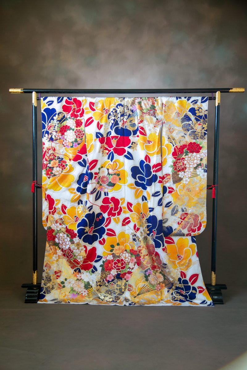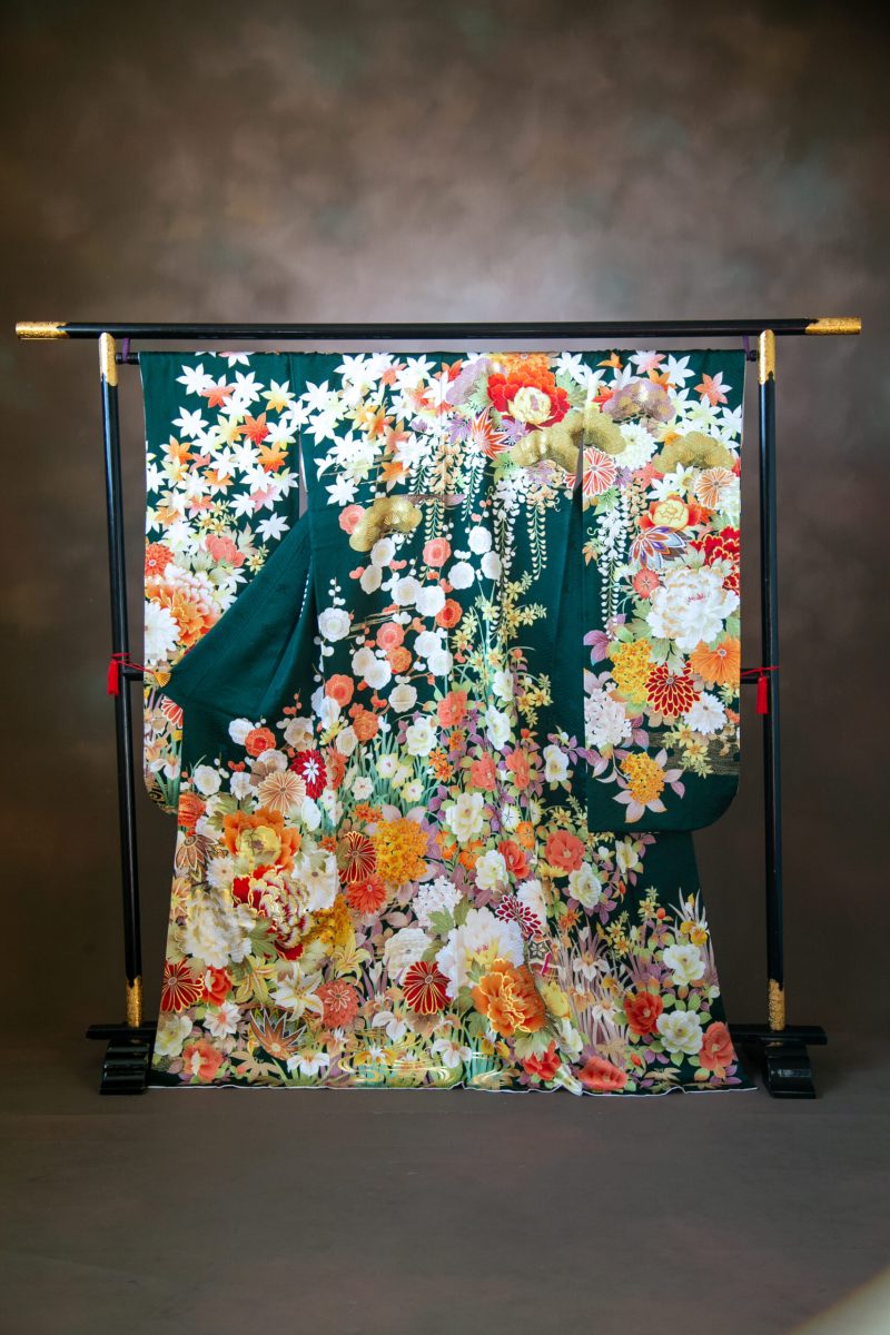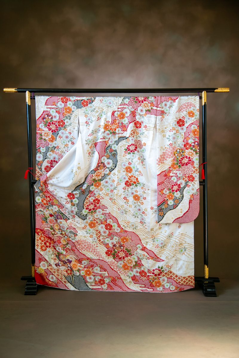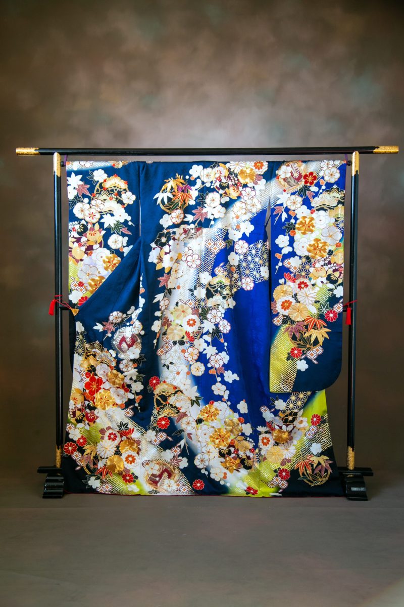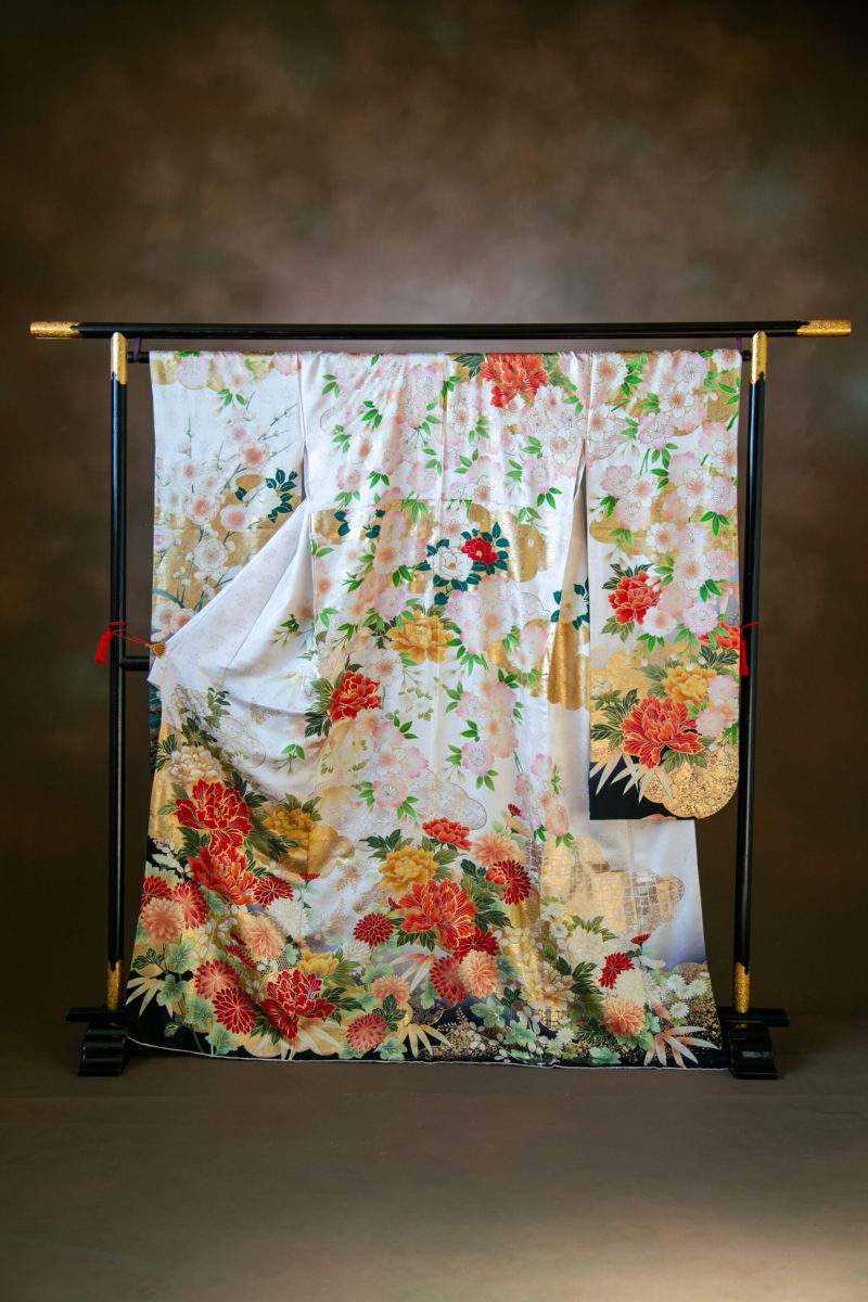 振袖一式に含まれるもの(振袖、帯、長襦袢(半衿付き)、帯揚げ、帯締め、重ね衿、腰紐5本、伊達巻2本、衿芯、前板(大小)、帯枕)※草履バッグ、肌着、足袋、ショールは別料金にてお受けいたします。