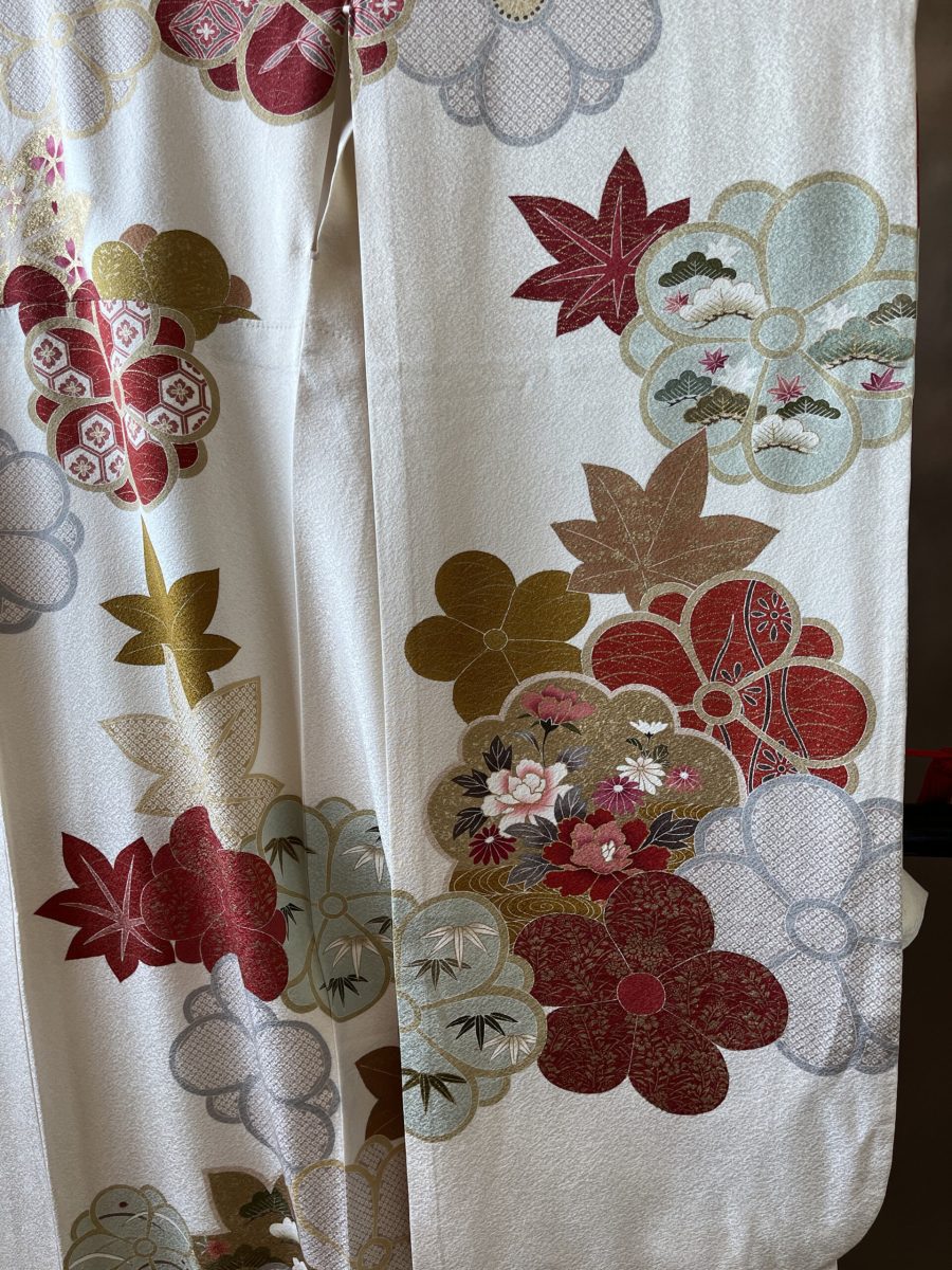 振袖一式に含まれるもの(振袖、帯、長襦袢(半衿付き)、帯揚げ、帯締め、重ね衿、腰紐5本、伊達巻2本、衿芯、前板(大小)、帯枕)※草履バッグ、肌着、足袋、ショールは別料金にてお受けいたします。