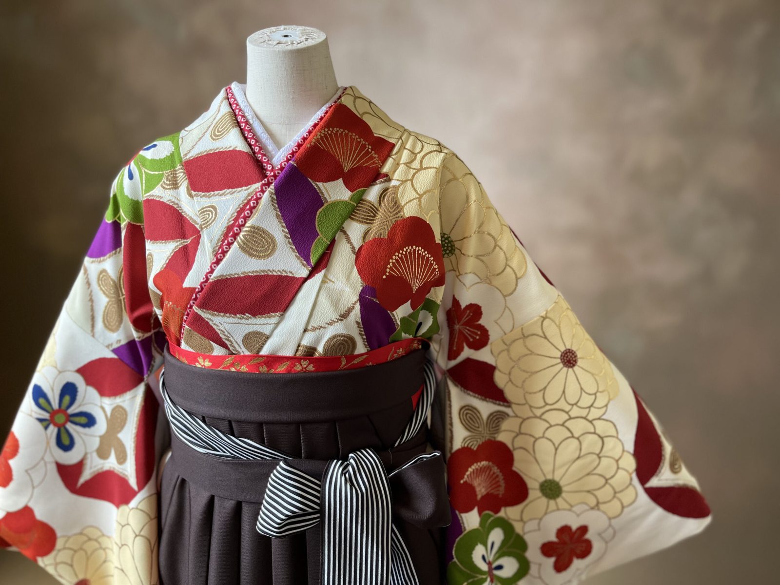 卒業袴・小学校卒業袴一式に含まれるもの(着物、袴、長襦袢、半幅帯、重ね衿、腰紐(2本〜4本)、伊達巻(1本〜2本)、前板、衿芯)※肌着、足袋、草履バッグは別料金にてお受けいたします。