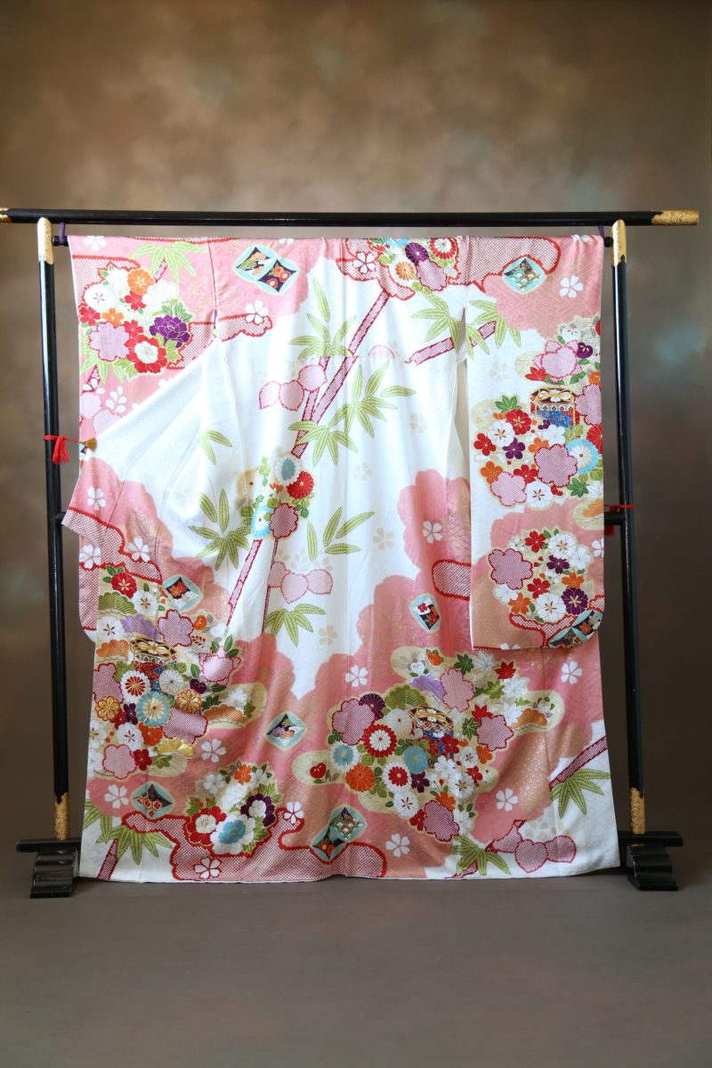 振袖一式に含まれるもの(振袖、帯、長襦袢(半衿付き)、帯揚げ、帯締め、重ね衿、腰紐5本、伊達巻2本、衿芯、前板(大小)、帯枕)※草履バッグ、肌着、足袋、ショールは別料金にてお受けいたします。